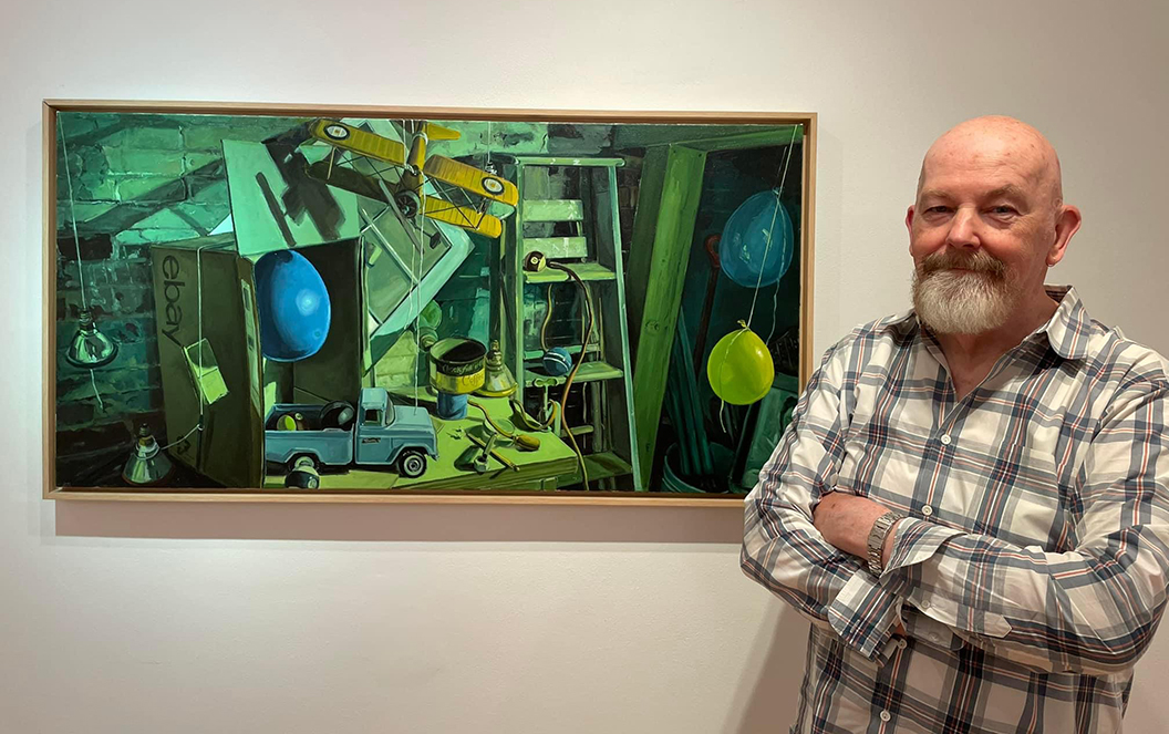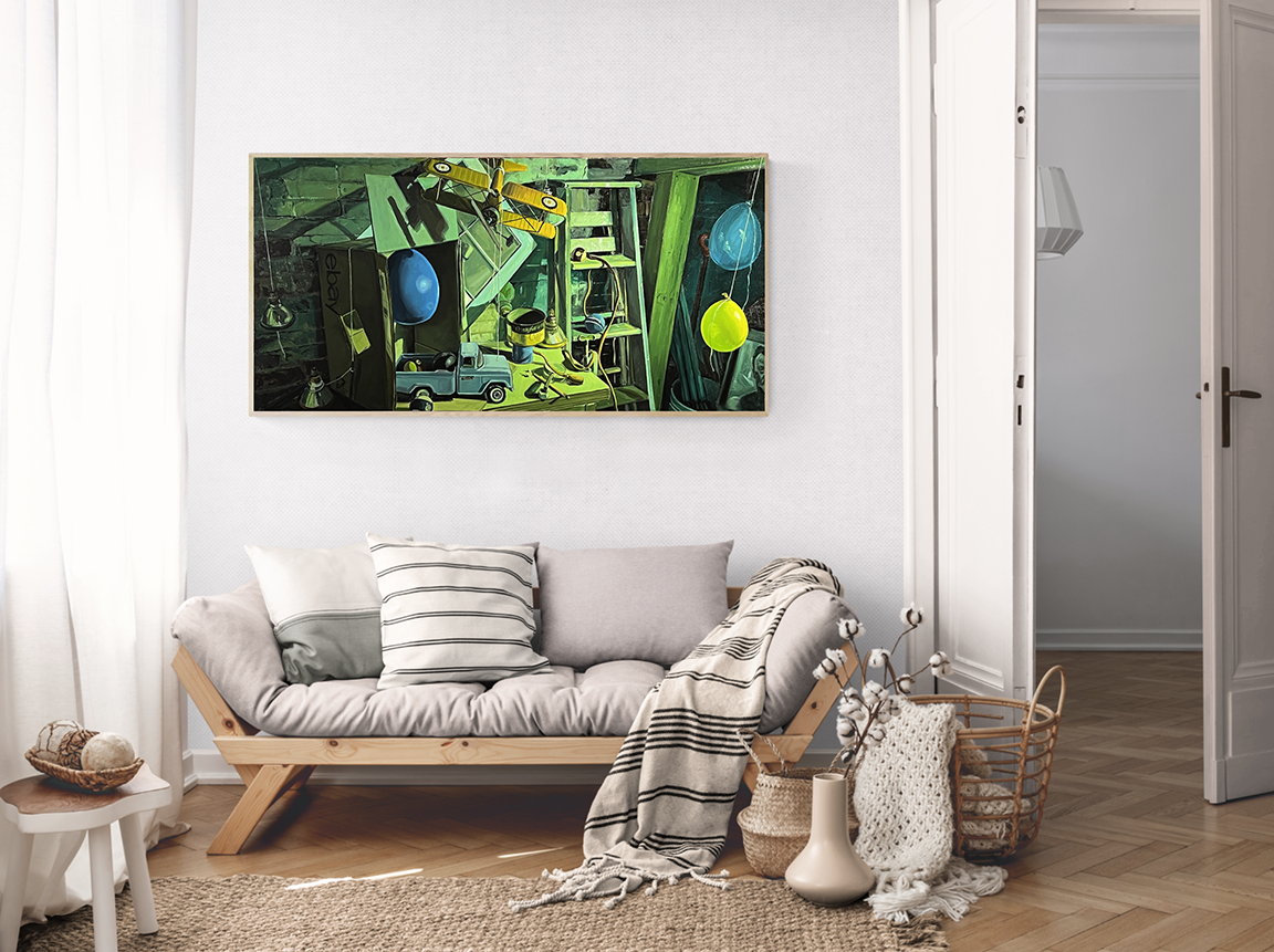 When I’m starting a painting, I always look at the color of the various components and imagine how they can be placed within the composition to create interest and drama. I’m also interested in how different lighting approaches can heighten the visual experience. For example, the use of a green floodlight in this arrangement dramatically changes the character of the individual objects, creating a more engaging visual experience for the viewer. This piece includes some of my favorite antique toys, along with the orange extension cord that has wormed its way into several pieces. The addition of suspended balloons, light bulbs and the biplane help create visual interest around the composition, and add to the illusion of depth. Completed in 2022, this piece is oil on canvas, 24″h X 48″w, and is framed.