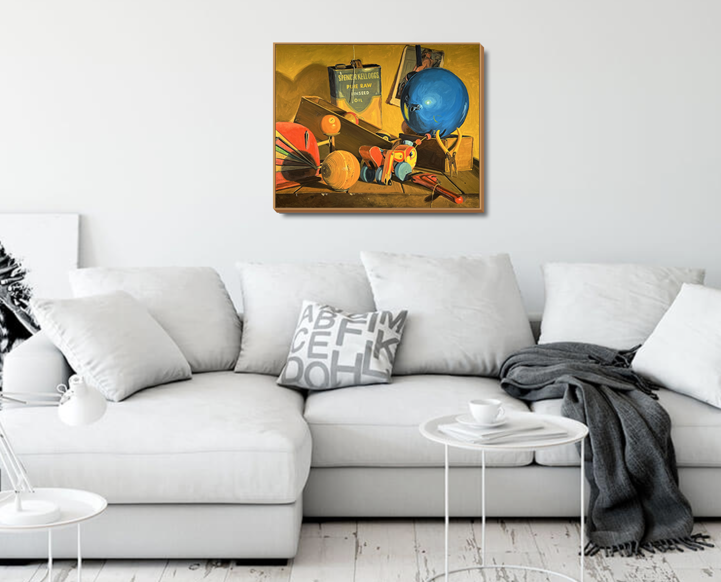 When I returned to painting in 2010 after my nearly 20-year hiatus, objects such as these became ideal subjects for my still life paintings. Augmenting my trove of highly unusual industrial items with colorful tin toys, croquet and billiard balls and balloons continues to provide me with an endless source of inspiration and discovery. Completed in 2022, this piece is oil on cradled wood panel, 24"h x 30"w, and is framed.