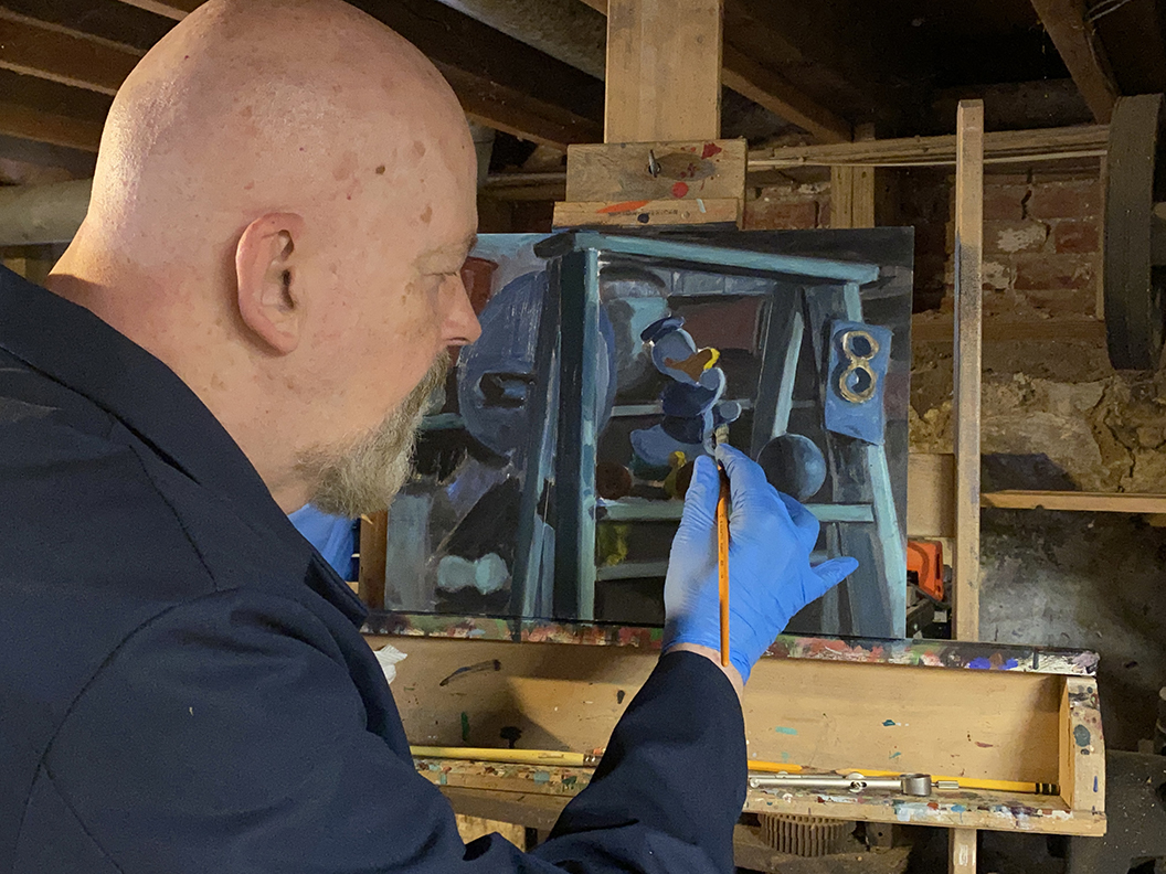 I’m perpetually fascinated by old and antique toys, hand tools and the like, along with balls of all size and colors. This wooden Donald Duck pull toy from the 1950s was found in the attic of my parent’s home... I don’t ever recall it having been mine, so I presume it belonged to my older siblings. It has the perfect combination of shape, color, and playfulness that I find interesting, and it has made an appearance in several of my paintings since I returned to painting back in 2010. When I’m starting a painting, I look at the color of the various components and imagine how they can be placed within the composition to create interest and drama. I’m also interested in how different lighting approaches can heighten the visual experience. For example, the use of a blue floodlight in this arrangement dramatically heightens the character of the individual objects, while the placement of the duck on the ladder adds to the illusion of depth, creating a more engaging visual experience for the viewer. This one is a personal favorite of mine!