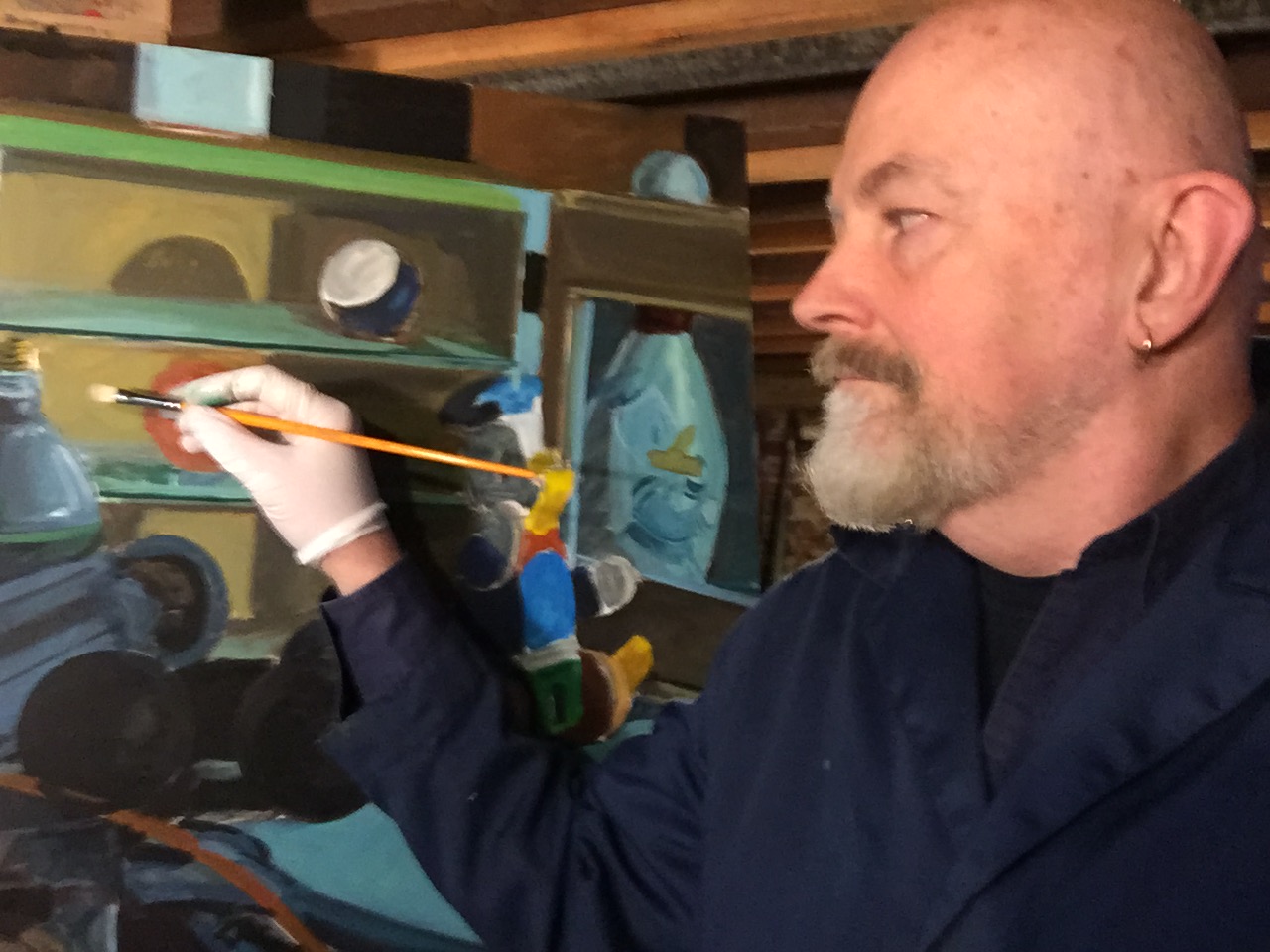 My father was a machinist... a tool-and-die maker; he worked for the same company for 47 years! During WW II, he fabricated parts for the turbines that powered submarines. Over time, as the company upgraded its machinery, they would scrap some of the old machines that no longer met their needs. My father, being “thrifty”, would acquire them, restore them to their former glory, and use them to provide freelance metalworking services to car mechanics and the like. Over time, he was able to outfit a small but practical machine shop in the basement of our home. One such machine is the small cast-iron lathe depicted here. Machines such as this one, along with its accompanying tools and miscellanea, have been a part of my life for the last 70 years. When I returned to painting in 2010 after a nearly 20-year hiatus, they became an ideal subject for my still life paintings. Augmenting that trove of highly unusual industrial items with colorful tin toys, croquet and billiard balls and balloons continues to provide me with an endless source of inspiration. Completed in 2017, this piece is oil on a cradled wood panel, 30"h X 40"w, and is framed.