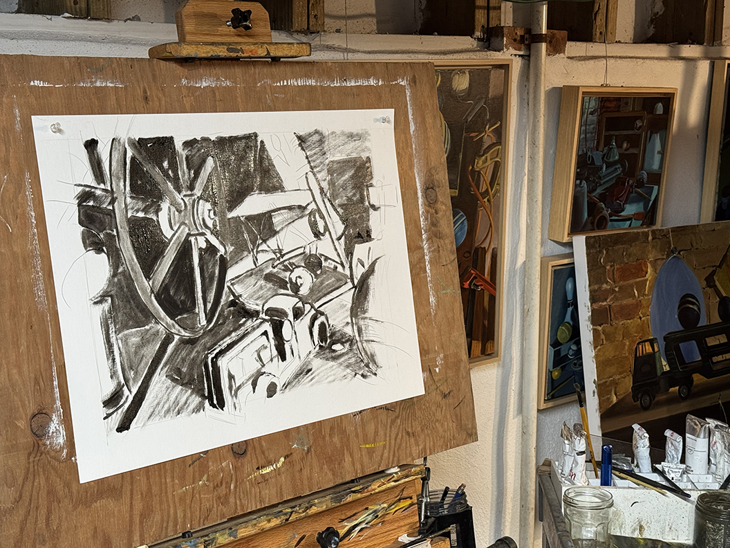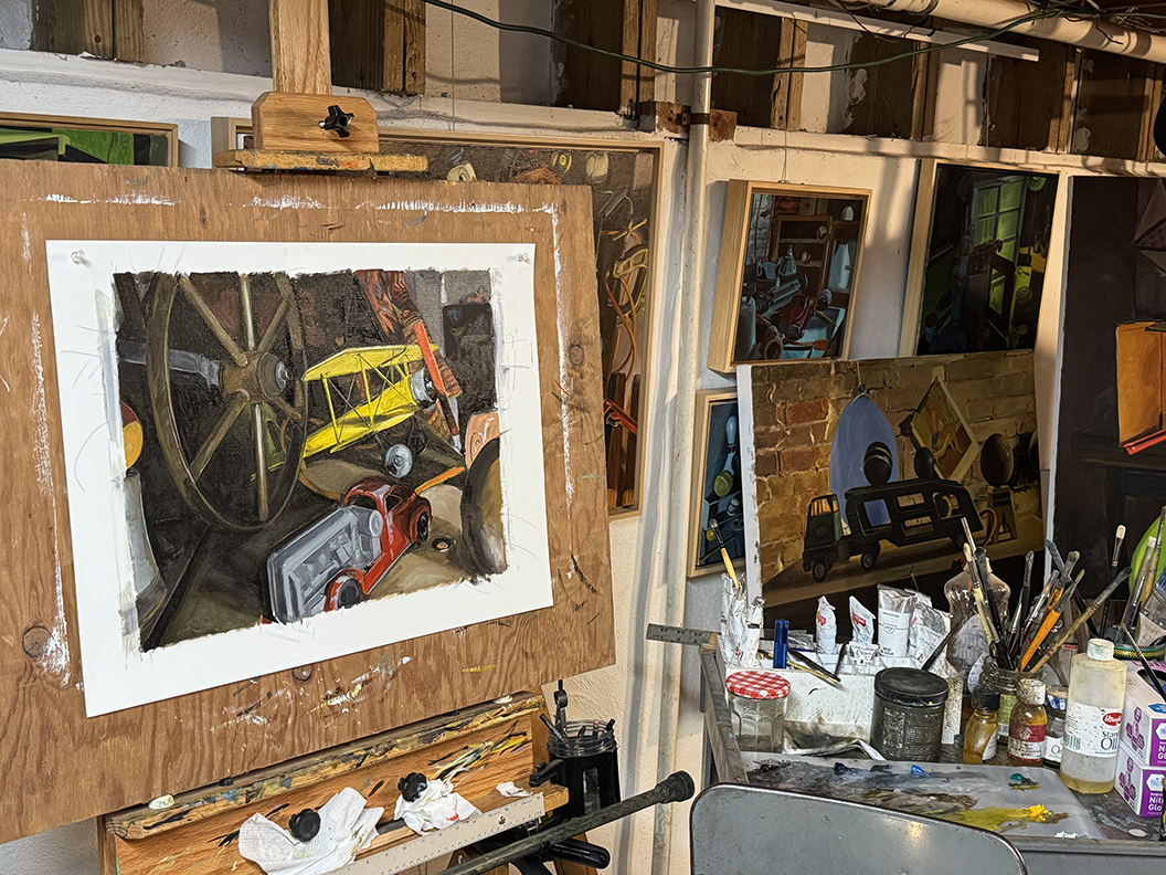 As I continued to explore the Work Party theme, I amassed an expanding collection of antique toys, hand tools, colorful balloons, croquet and billiard balls, and whatever else might catch my eye. These objects provided me with a way to compose arrangements and easily move shape and color around the canvas.